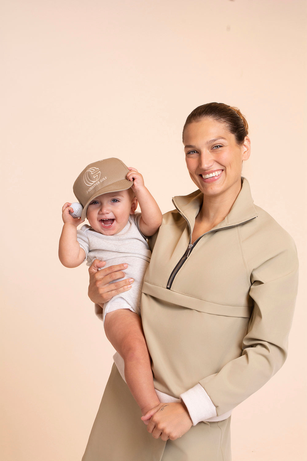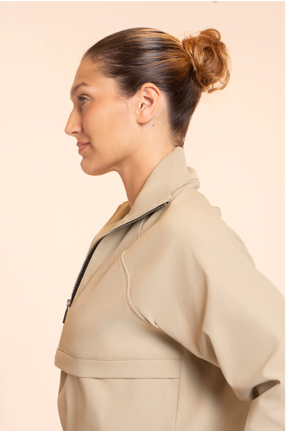 Your polished throw-on. The Tee Time Pullover is cut in luxe Japanese ECOPET® performance fabric (from upcycled bottles) with 4-way stretch and a smooth, elevated hand. A clean zip front (luxury zipper) keeps the line sharp, while a hidden front pouch discreetly stows tees, ball markers, cards, keys—even sunglasses. Soft 100% organic-cotton rib at the cuffs and hem adds comfort and structure so the silhouette stays refined. Finished with a stay-clean, stain-resistantand anti-microbial finish that keeps you fresh and game-ready. It elevates leggings, balances denim, and pairs perfectly with Ace—structure meets freedom in a single layer.
